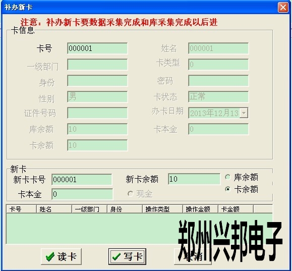 2. 此卡掛失后,然后點卡管理--補辦新卡,打開此對話框后輸入卡號后按回車鍵,當出現卡信息時,把新卡放到讀卡器上點讀卡,然后點寫卡即可,如下圖所示